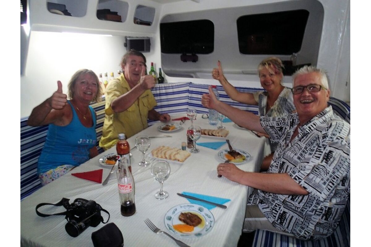 De ontbijten, aperitieven en diners worden op de catamaran geserveerd, terwijl de lunches op de visboten worden geserveerd in de vorm van complete lunchpakketten aan boord. Wat drankjes betreft: water in flessen is gratis en inbegrepen in het volpension van deze formule. Alle andere dranken zoals frisdranken, bieren, wijnen, sterke dranken, espresso koffie enz. zijn te verkrijgen tegen extra kosten en kunnen aan het eind van je verblijf ter plaatse worden betaald.