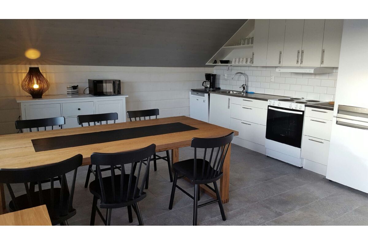 Er staat een leren bank in de woonkamer als ook een houtkachel en TV en er is een eetruimte in de open keuken. Er is ook een ruime badkamer met douche / toilet en nog een groot terras met buitenmeubilair.