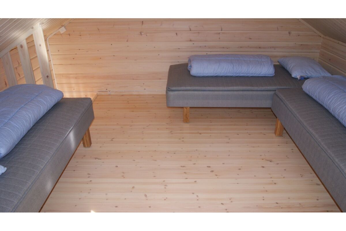 Deze 2-5-persoons ‘stugor’ zijn uitgerust met 3 bedden op de bovenverdieping en een slaapbank beneden. Er is een gasfornuis, serviesgoed, bestek, een koelkast, elektrische verwarming en een eethoek. Aan de voorkant van het huisje bevindt zich een veranda met een bankje en voor het huisje staat een picknicktafel.