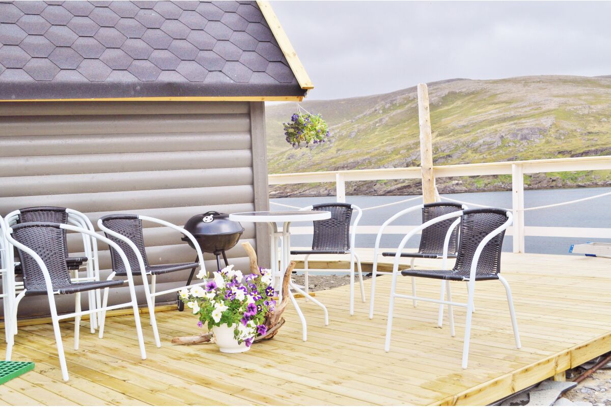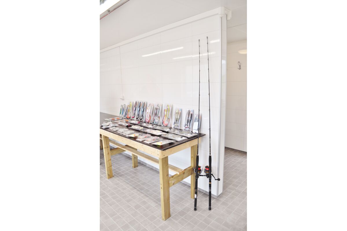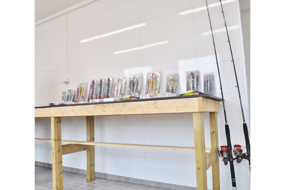 Naast de twee woonunits is er ook een service huis. Hier bevindt zich de overdekte fileerruimte met stromend water en ruime snijtafels. Natuurlijk is hier ook de grote vriezer zodat je de vis snel en comfortabel kan invriezen. Verder is er een ruimte met verwarming waar je je vispakken kan ophangen zodat je de volgende dag weer in een droog pak kan stappen. Boven in het service huis is ook nog een aparte woonunit voor 3 tot 4 personen wat ook wordt verhuurd. Er is ook nagedacht als je een grote hoeveelheid vis hebt gevangen en deze naar boven moet krijgen naar de fileerplaats. Hiervoor is een grote hydraulische kraan geplaatst om de kisten naar boven en beneden te kunnen tillen.